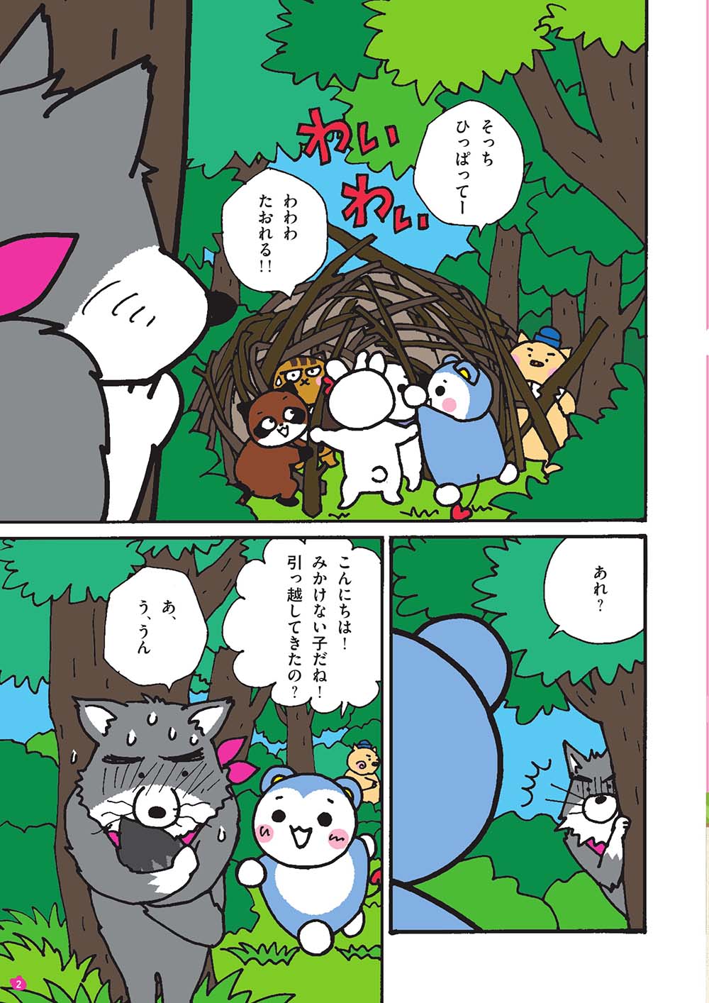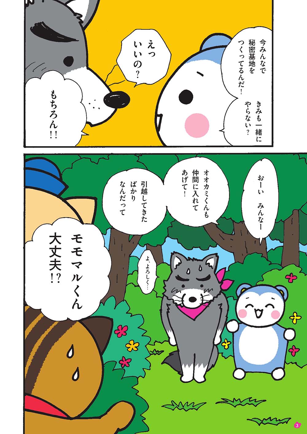いつもの森で新しい転校生、オオカミくんと出会ったモモマルくん。