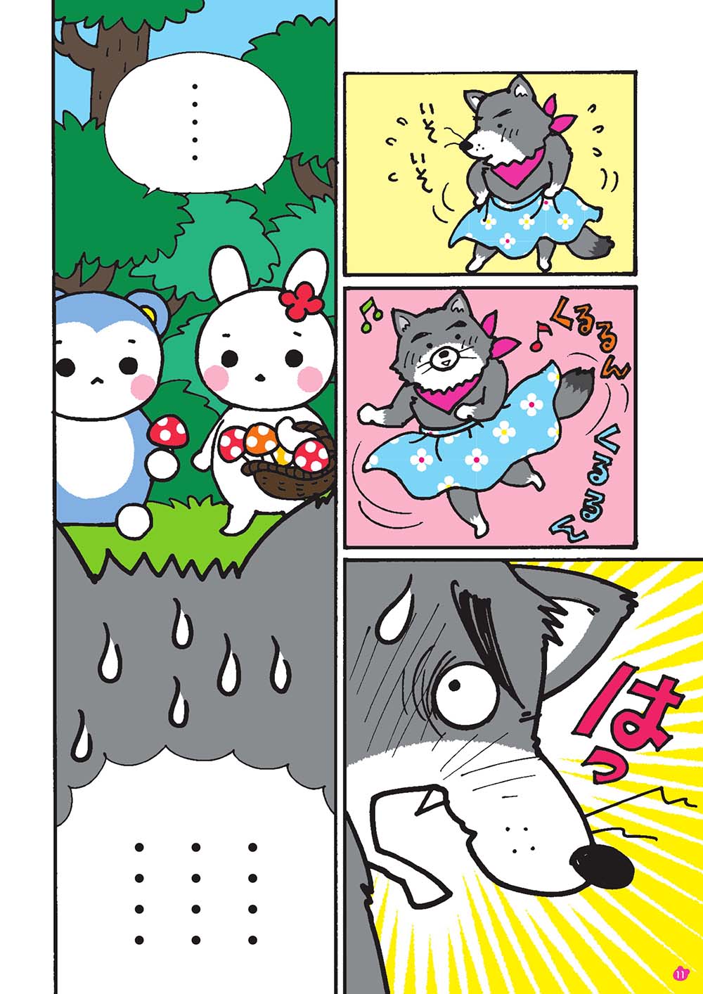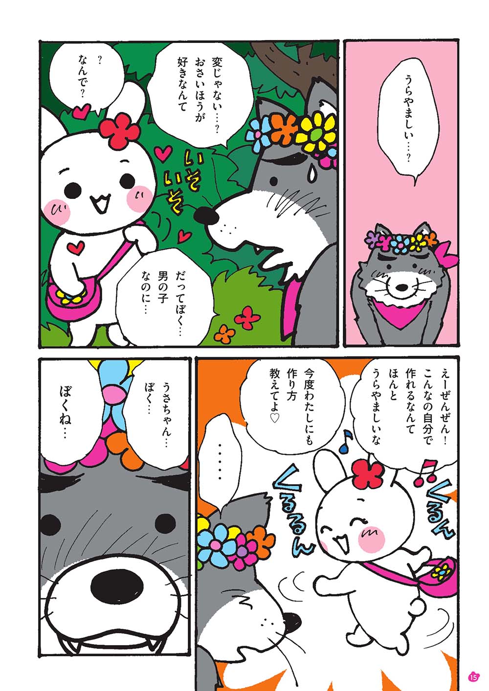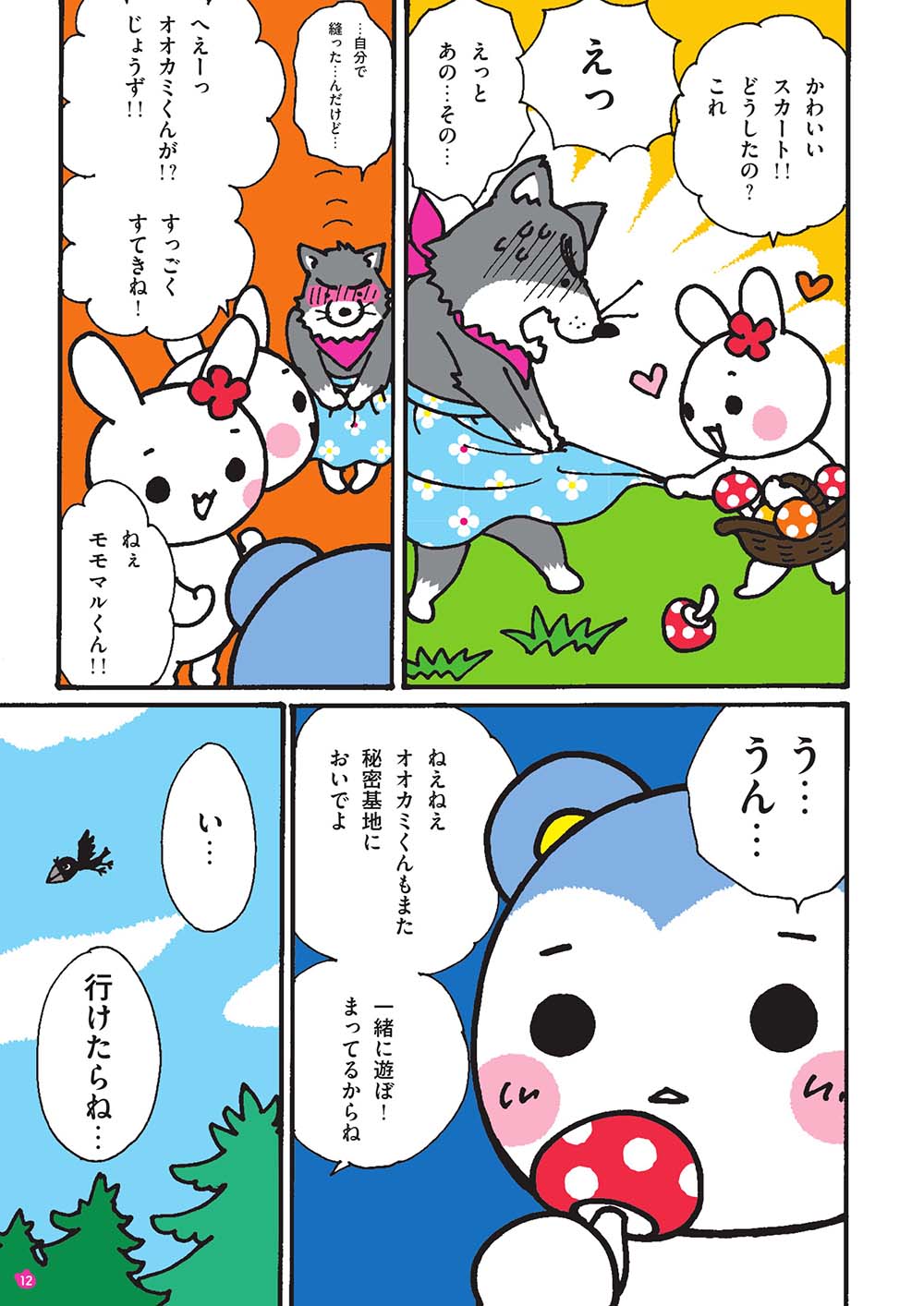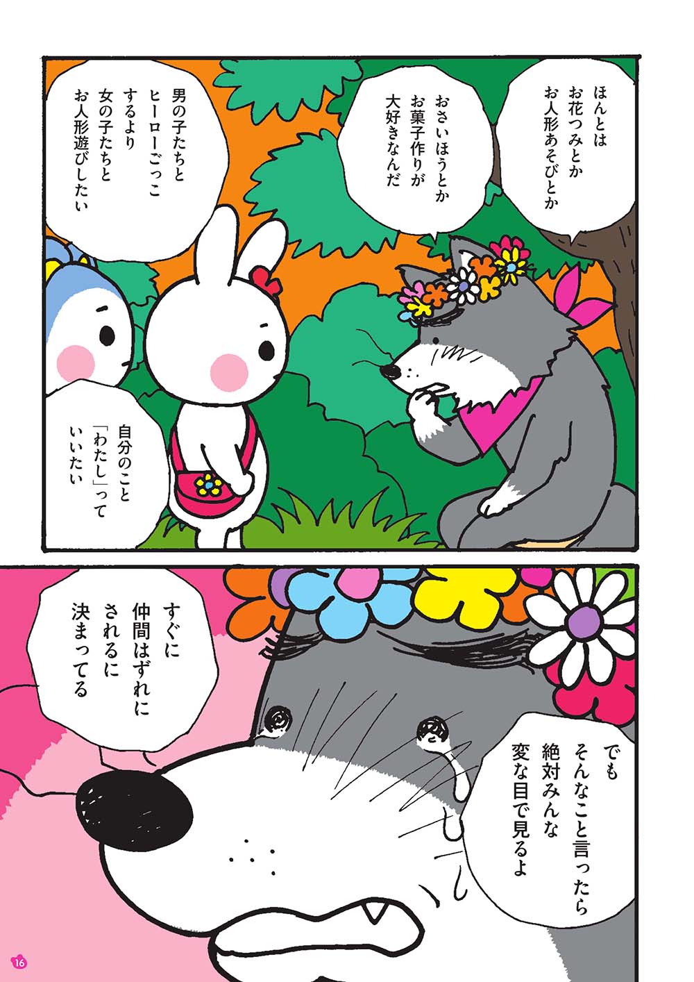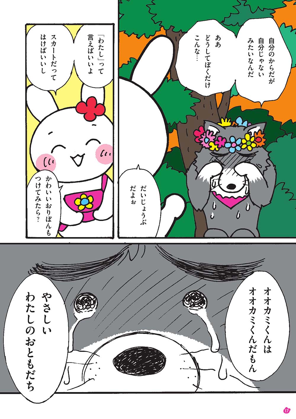 仲良くなったある日、「自分の体が自分じゃないみたい」と、オオカミくんは悩みを打ち明け、「女の子たちとお人形遊びがしたい」「『わたし』っていいたい」と、モモマルくんとウサちゃんを前に泣き出しました。