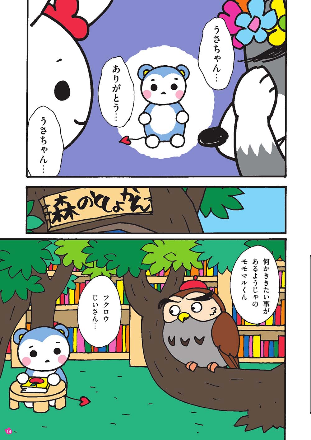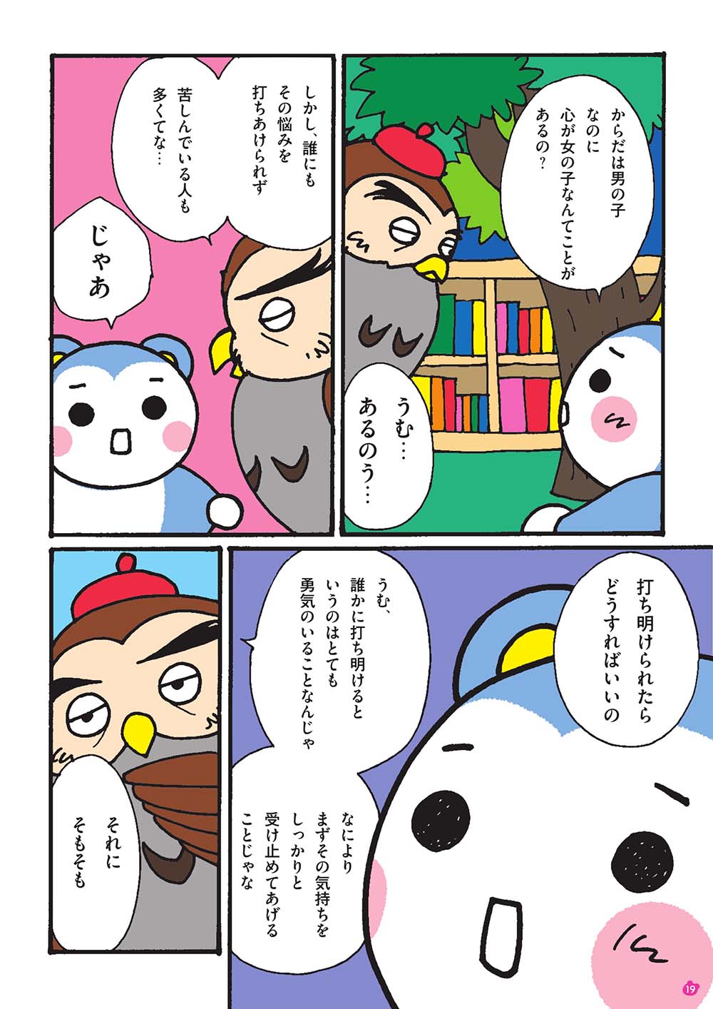 オオカミくんの突然の告白に戸惑いながらも、森のものしり、ふくろうじいさんに尋ね、「体は男の子で心が女の子」な人がいるということを初めて知ったモモマルくん。
